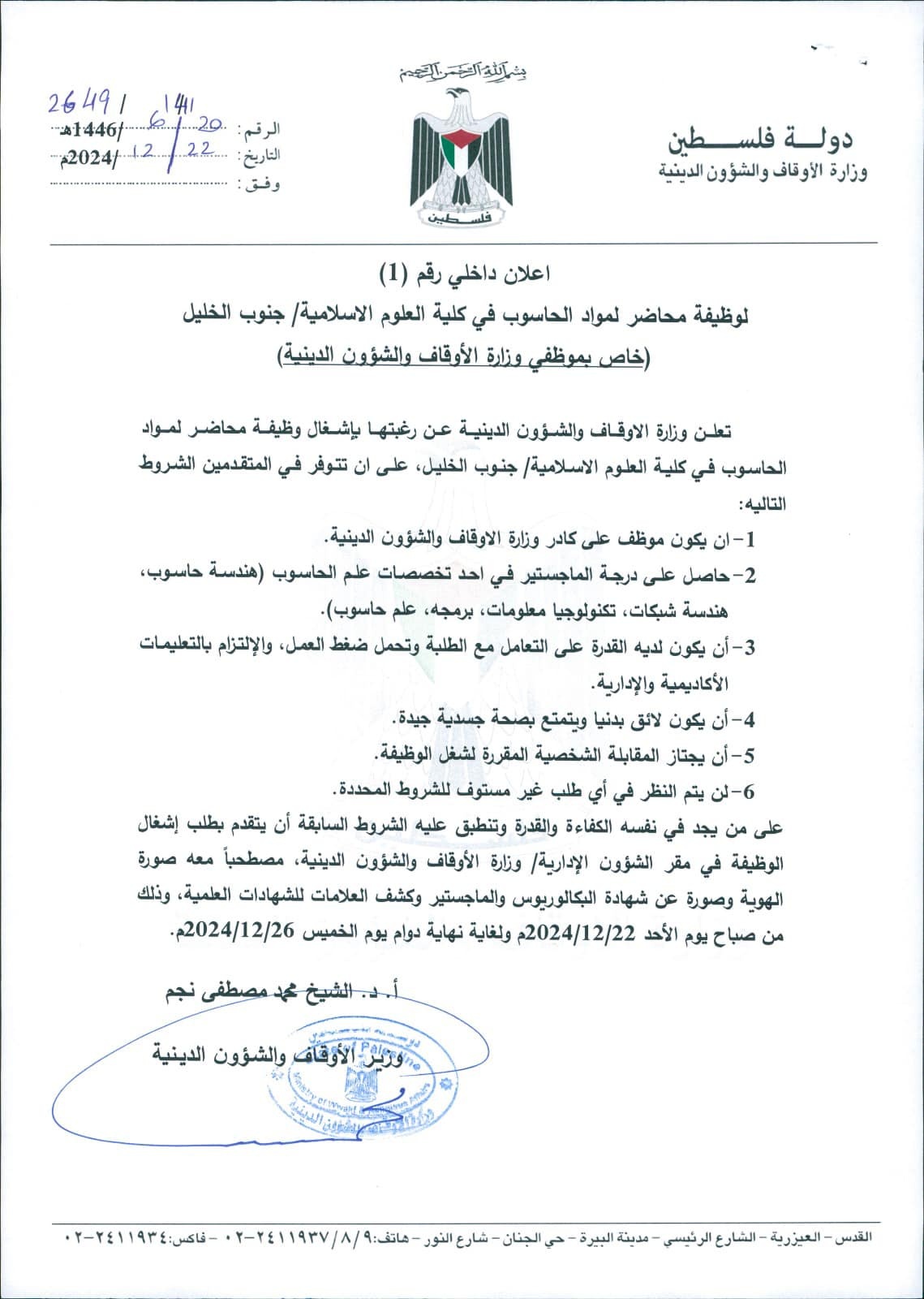 اعلان داخلي رقم (1) (لوظيفة محاضر لمواد الحاسوب في كلية العلوم الإسلامية)